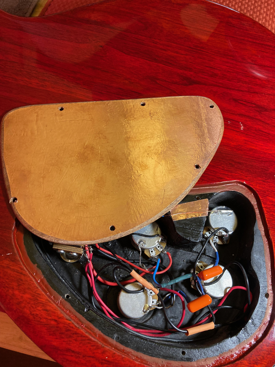 Copper sheet provides a bit of shielding (cavity is not fully shielded) - thin wire connects the bridge hardware (and strings/tailpiece) to electronics ground to reduce hum